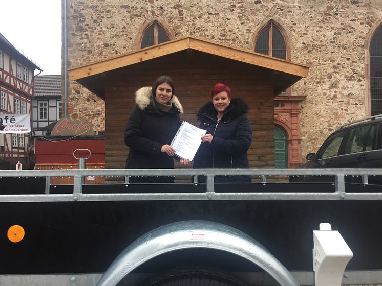 Den zweiten Preis, einen Fahrzeuganhänger aus der Hephata-Metallwerkstatt, hat Gewinnerin Stefanie Bujakowski gleich am Montagmorgen bei der Hephata-Auszubildenden Stefanie Delgado auf dem Paradeplatz in Ziegenhain abgeholt.