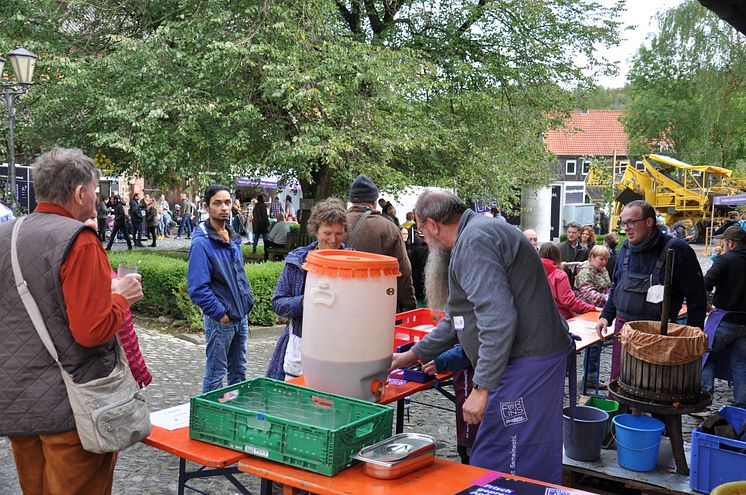 Reges Markttreiben: Zahlreiche Besucher zog das Erntedankfest auf das Bio-Hofgut Richerode. Beliebt war vor allem die Saftpresse, an der Hephata-Mitarbeiter Bernhard Groß und sein Team frisch gepressten Saft aus Äpfel, Birnen und Möhren anboten.