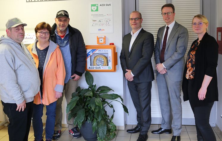 Nadine Florczak (v.l.) über den von der Bank gespendeten und von Laien bedienbaren Defibrillator.