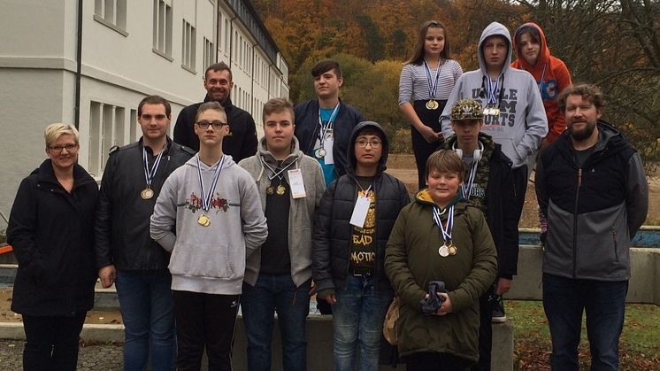 Das Schwimmteam der Hermann-Schuchard-Schule: Hinten (von links): Martin Lohmann (Trainer), Florian Althainz, Vanessa Buro, Gabriel Schmidt und Jill Trexler. Vorne (von links): Judith Pfaff (Trainerin), Nino Knieling, Robin Schleicher, Patrick Lerch, Maximilian Eckhardt, Artur Kufeld, Sebastian Mathes und Thomas Hüsken (Trainer).