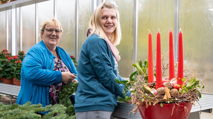 Kranz um Kranz binden Stefanie Schrimpf (rechts) und Sabine Schäfer in diesen Tagen. Gemeinsam mit ihren Kollegen bereiten sie die Adventsausstellung in der Hephata-Gärtnerei am Samstag, 23. November, vor. Von 13 bis 18 Uhr bietet die Gärtnerei in Schwalmstadt-Treysa Kränze, Gestecke und Weihnachtssterne aus eigenem Anbau an. Kunden finden im vielfältigen Sortiment Adventsdeko mit sozialem Mehrwert und für einen kleinen Imbiss ist am Samstag ebenfalls gesorgt. Vom 25. bis 29. November 2019 ist die Hephata-Gärtnerei außerdem täglich durchgehend von 8 bis 16 Uhr geöffnet.