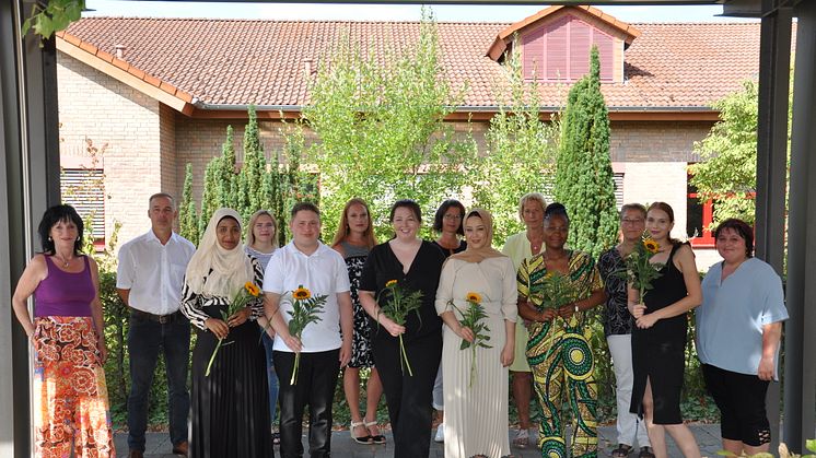 Bildunterschrift: Strahlende Gesichter nach bestandener Prüfung: Auf dem Bild die Absolventen und Ausbilder des KPH-Kurses (vordere Reihe, von links):Hawi Jamal (Schwalmstadt), Felix Herrmann (Haina/Kloster), Robine Bender (Willingshausen), Narges Salehi (Gudensberg), Gina Kalonji und Lara Kufalk (beide Schwalmstadt). Dahinter (von links) Heidrun Freitag (Schulleitung Krankenpflegehilfeschule Hephata), Alexander Stein (Geschäftsführer Hephata-Klinik), Angelika Bergert (Praxisanleiterin der Hephata-Klinik), Veronika Brening (QM-Beauftragte Hephata-Klinik), Nadine Becker (Praxisanleiterin Asklepios-Klinik), Anja Wiegand (Sekretariat Geschäftsführung Hephata-Klinik), Anita Zimmermann (Dozentin) und Angela Gumenscheimer (Praxisanleiterin Hephata-Klinik).