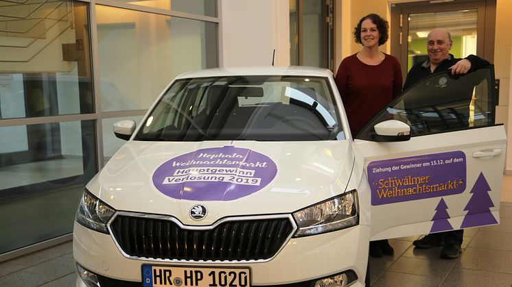Wer in diesen Tagen das Hephata-Gesundheitszentrum mit seinen zahlreichen Facharztpraxen betritt, mag sich wundern, warum im gläsernen Atrium ein Auto parkt. Die auffällige Beklebung des Skoda Fabias liefert die Erklärung – es handelt sich um den Hauptgewinn der Schwalmstädter Weihnachtsmarkt-Verlosung. „Das Auto ist ein toller Werbeträger für unsere Veranstaltungen und die Verlosung zum Abschluss des Schwälmer Weihnachtsmarktes wird sicher wieder ein absolutes Highlight, das viele Menschen auf den Paradeplatz lockt“, ist sich Gerhard Reidt von der Schwalm-Touristik sicher. Der Organisator des Schwälmer Weihnachtsmarktes und Hans-Dampf-in-allen-Gassen kümmert sich gemeinsam mit der Hephata Diakonie um die Vermarktung der Lose und hat in den vergangenen Tagen zahlreiche Vorverkaufsstellen in Schwalmstädter Einzelhandelsgeschäften eingerichtet – unter anderem auch in der Apotheke im Gesundheitszentrum, wo das Auto derzeit ausgestellt ist.