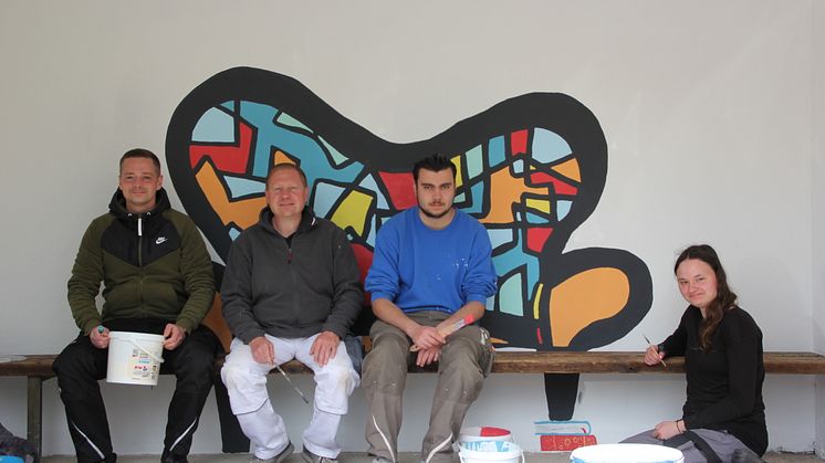 Insgesamt rund 1200 gemeinnützige Arbeitsstunden vor Ort haben die jungen Menschen geleistet, die aktuell eine Ausbildung in den Gewerken Farbe, Garten- und Landschaftsbau, Hauswirtschaft, Holz und Metall machen. Sie konnten sich dabei in verschiedene Projekte einwählen. „Toll war, dass die Auszubildenden die Chance hatten, ein anderes Gewerk auszuprobieren“, sagt Sozialpädagoge Nicolai Staufenberg. Shirley Püschl etwa, eigentlich Lernende der Holzwerkstatt, wählte sich ins Team der Farbwerkstatt um Bernd Koch ein. Zusammen mit anderen hat sie eine Bushaltestelle aus Betonguss per Hochdruckreiniger abgespritzt, später grundiert, gestrichen und als Highlight rund um die Sitzbank der Haltestelle ein stilisiertes Sofa gemalt.