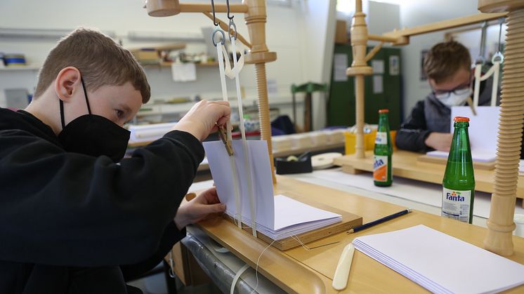 Yannik (12) und Paul (13) besuchten die Für Uns-Manufaktur Treysa. Sie lernten die Arbeit in der Buchbinderei kennen und nahmen nach einem Rundgang durch die Manufaktur selbst an der „Heftlade“ Platz. An diesem Arbeitsplatz werden die einzelnen Papierseiten mit Nadel und Leinenfaden geheftet – bis sie zu einem Buch werden. „Die Buchbinderei ist durch die vielen Schritte, die in Handarbeit durchgeführt werden, ein sehr interessanter Arbeitsbereich“, sagt Arbeitsgruppenleiterin Elisabeth Schick. „Und die Schüler haben heute Mittag etwas zum Mitnehmen, das sie selbst hergestellt haben.“ Derzeit arbeiten 21 Beschäftigte in der Buchbinderei.