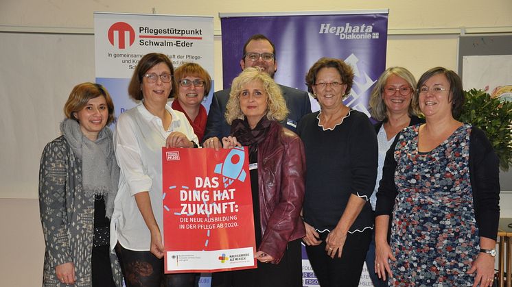 Pflegeberufe haben Zukunft: Davon waren die Veranstalter der Informationsveranstaltung in der Hephata-Akademie überzeugt. Auf dem Bild (von links) Veronika Wildemann, Ilona Seibel, Natalia Cieslar (Hephata-Akademie für soziale Berufe), Henning Pfannkuch und Sonja Weidel (Pflegestützpunkt Schwalm-Eder), Nicole Benthin (Hessisches Sozialministerium), Heike Thomas (Regierungspräsidium Gießen) und Ina Peter (Bundesamt für Familie).