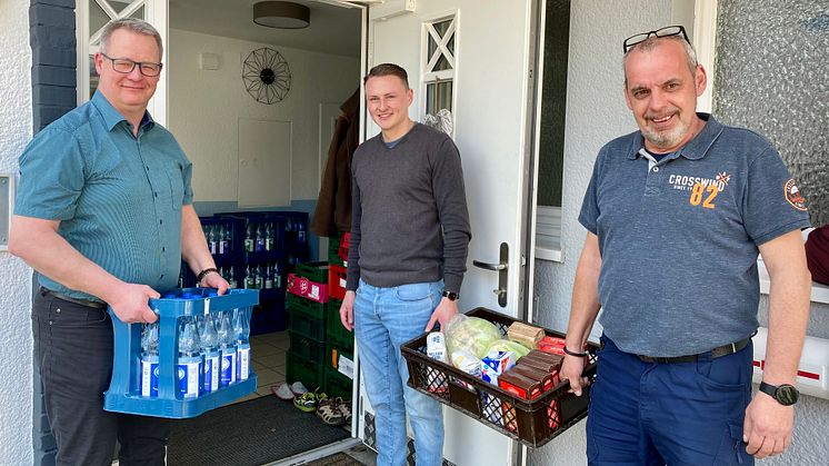 Sie haben die Koordination und Organisation für das Wohnangebot für Geflüchtete in der Hephata-Jugendhilfe übernommen: von links Regionalleiter Mitte Markus Kink mit Heiko Richhardt und Heiko Schmidt beim Verladen der Lebensmittel.