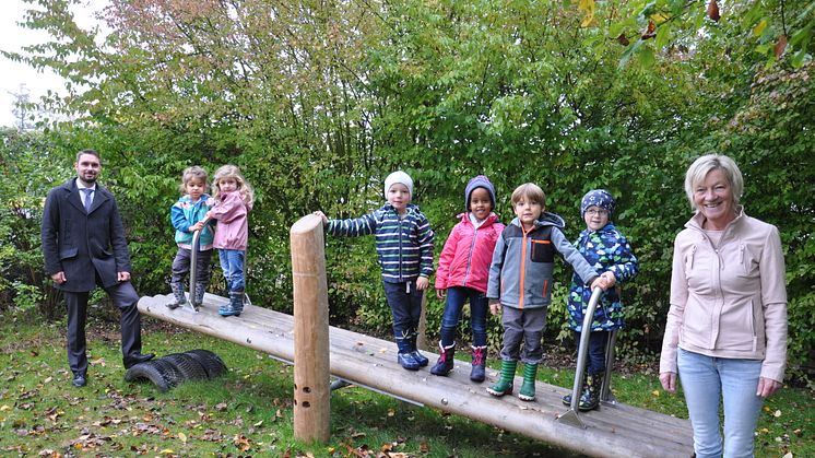 Sie ist aus Lärchenholz und bietet Spaß für gleich mehrere Kinder: Die neue Stehwippe der Hephata-Kindertagesstätte. Möglich wurde die Anschaffung durch eine Spende der VR-Bank Hessenland.