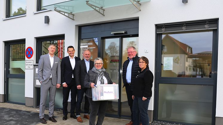 Bildunterschrift: Daniel Schote und Dr. Constantin Schmitt, Geschäftsführung Lanos Care GmbH, Harald Merzendorfer, Regionalleiter der Sozialen Rehabilitation Hephatas, Bürgermeister Jürgen Liebermann und Bärbel Eckhardt, in Vertretung von Pfarrerin Christiane Kunkel und der Landfrauen Schwarzenborn (von links), begrüßen Gudrun Sommer-Werner in den neuen Büroräumen im MVZ Schwarzenborn.
