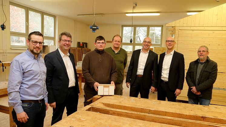 Auszubildender Leon Fahlbusch (3.v.l.) präsentierte den Gästen das Modell für sein Gesellenstück (von links): Hephata-Spendenbeauftragter Sebastian Nicolai, Sparkassen-Vorstand Thomas Roß, Ausbildungsmeister Frank Möller, Sparkassen-Vorstand Michael von Bredow, Hephata-Vorstand Dr. Michael Gerhard und Berufshilfe-Teamleiter Ingo Kurz.