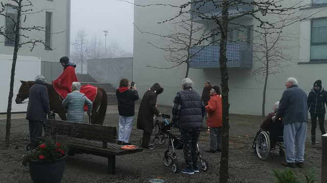 Die Ankunft der Reiterin mit Pferd sprach sich in der kleinen Senioreneinrichtung schnell herum. Die Bewohner*innen kamen nach draußen und freuten sich über den ungewöhnlichen Besuch. Bewohner*innen, die nicht nach draußen konnten, begleiteten die Pflegekräften an die großen Fenster der Einrichtung, um den Martinsbesuch mitzuerleben.