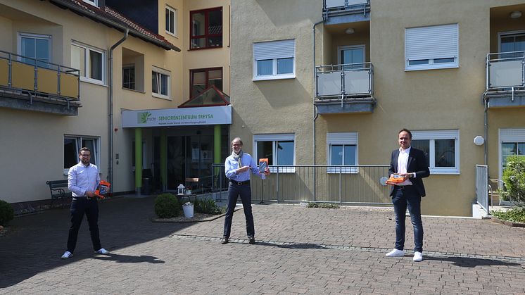 Übergabe der ersten gespendeten Tablets: Der Hephata-Spendenbeauftragte Sebastian Nicolai und Kommunikationsleiter Johannes Fuhr haben Hermann-Josef Nelles, Geschäftsführer der Tochtergesellschaft hsde, 15 Geräte für die Videotelefonie von Bewohnerinnen und Bewohnern mit ihren Angehörigen gebracht.