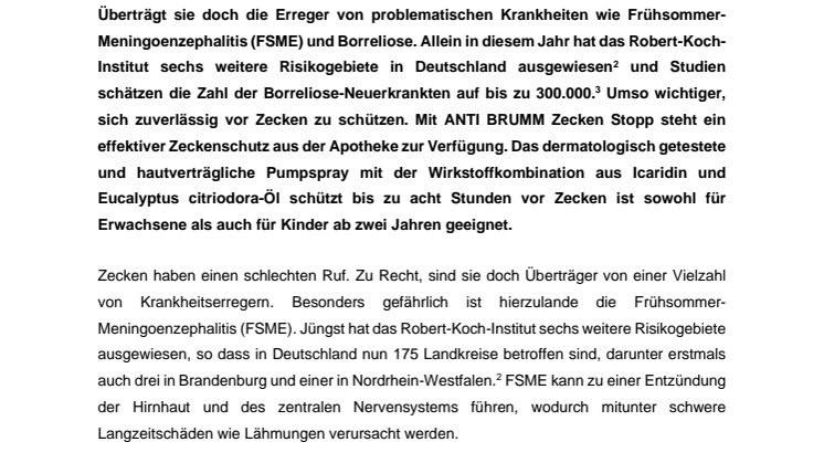 Die Zecke ist das gefährlichste Tier Deutschlands. [1]Überträgt sie doch die Erreger von problematischen Krankheiten wie Frühsommer-Meningoenzephalitis (FSME) und Borreliose. Allein in diesem Jahr hat das Robert-Koch-Institut sechs weitere Risikogebiete in Deutschland ausgewiesen [2]und Studien schätzen die Zahl der Borreliose-Neuerkrankten auf bis zu 300.000. [3]Umso wichtiger, sich zuverlässig vor Zecken zu schützen. Mit ANTI BRUMM Zecken Stopp steht ein effektiver Zeckenschutz aus der Apotheke zur Verfügung. Das dermatologisch getestete und hautverträgliche Pumpspray mit der Wirkstoffkombination aus Icaridin und Eucalyptus citriodora-Öl schützt bis zu acht Stunden vor Zecken ist sowohl für Erwachsene als auch für Kinder ab zwei Jahren geeignet.