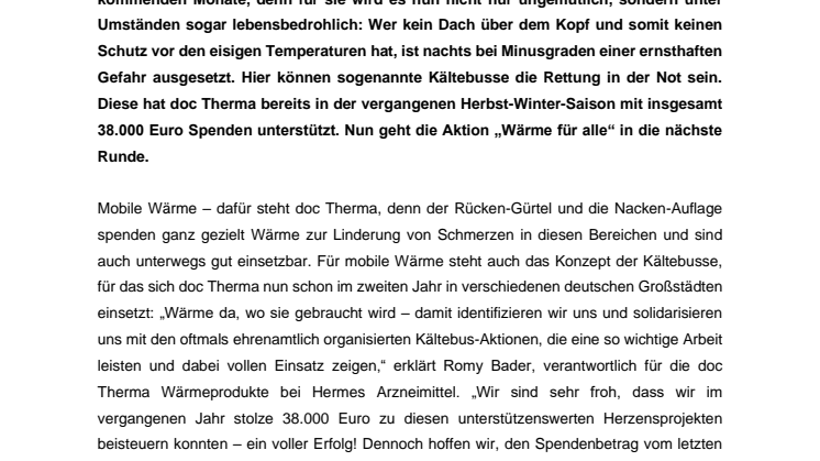 Mobile Wärme – dafür steht doc Therma, denn der Rücken-Gürtel und die Nacken-Auflage spenden ganz gezielt Wärme zur Linderung von Schmerzen in diesen Bereichen und sind auch unterwegs gut einsetzbar. Für mobile Wärme steht auch das Konzept der Kältebusse, für das sich doc Therma nun schon im zweiten Jahr in verschiedenen deutschen Großstädten einsetzt: „Wärme da, wo sie gebraucht wird – damit identifizieren wir uns und solidarisieren uns mit den oftmals ehrenamtlich organisierten Kältebus-Aktionen, die eine so wichtige Arbeit leisten und dabei vollen Einsatz zeigen,“ erklärt Romy Bader, verantwortlich für die doc Therma Wärmeprodukte bei Hermes Arzneimittel. „Wir sind sehr froh, dass wir im vergangenen Jahr stolze 38.000 Euro zu diesen unterstützenswerten Herzensprojekten beisteuern konnten – ein voller Erfolg! Dennoch hoffen wir, den Spendenbetrag vom letzten Winter in dieser Saison noch übertreffen zu können,“ kündigt sie an.