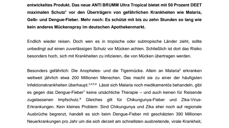 ANTI BRUMM, der Spezialist für Mücken- und Zeckenschutz aus der Apotheke, erweitert das Sortiment um ein speziell für die Tropen entwickeltes Produkt. Das neue ANTI BRUMM Ultra Tropical bietet mit 50 Prozent DEET maximalen Schutz1 vor den Überträgern von gefährlichen Krankheiten wie Malaria, Gelb- und Dengue-Fieber. Mehr noch: Es schützt mit bis zu zehn Stunden so lang wie kein anderes Mückenspray im deutschen Apothekenmarkt.