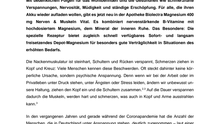 Mit dem neuen Biolectra Magnesium 400 mg Nerven & Muskeln Vital den Akku aufladen