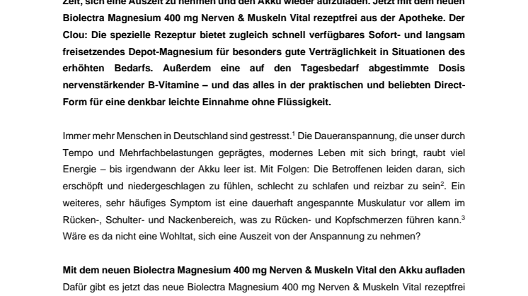 Ständig erschöpft, ausgepowert, angespannt? Höchste Zeit, sich eine Auszeit zu nehmen und den Akku wieder aufzuladen. Jetzt mit dem neuen Biolectra Magnesium 400 mg Nerven & Muskeln Vital rezeptfrei aus der Apotheke. Der Clou: Die spezielle Rezeptur bietet zugleich schnell verfügbares Sofort- und langsam freisetzendes Depot-Magnesium für besonders gute Verträglichkeit in Situationen des erhöhten Bedarfs. Außerdem eine auf den Tagesbedarf abgestimmte Dosis nervenstärkender B-Vitamine – und das alles in der praktischen und beliebten Direct-Form für eine denkbar leichte Einnahme ohne Flüssigkeit.