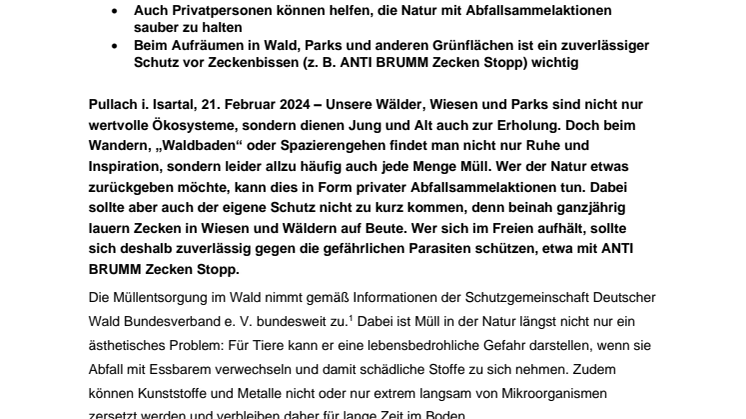 Unsere Wälder, Wiesen und Parks sind nicht nur wertvolle Ökosysteme, sondern dienen Jung und Alt auch zur Erholung. Doch beim Wandern, „Waldbaden“ oder Spazierengehen findet man nicht nur Ruhe und Inspiration, sondern leider allzu häufig auch jede Menge Müll. Wer der Natur etwas zurückgeben möchte, kann dies in Form privater Abfallsammelaktionen tun. Dabei sollte aber auch der eigene Schutz nicht zu kurz kommen, denn beinah ganzjährig lauern Zecken in Wiesen und Wäldern auf Beute. Wer sich im Freien aufhält, sollte sich deshalb zuverlässig gegen die gefährlichen Parasiten schützen, etwa mit ANTI BRUMM Zecken Stopp.