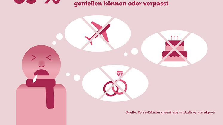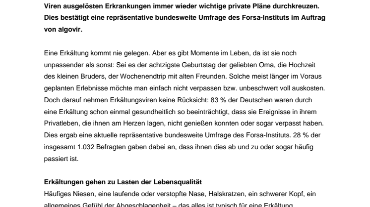 Eine Erkältung kommt nie gelegen. Aber es gibt Momente im Leben, da ist sie noch unpassender als sonst: Sei es der achtzigste Geburtstag der geliebten Oma, die Hochzeit des kleinen Bruders, der Wochenendtrip mit alten Freunden. Solche meist länger im Voraus geplanten Erlebnisse möchte man einfach nicht verpassen bzw. unbeschwert voll auskosten. Doch darauf nehmen Erkältungsviren keine Rücksicht: 83 % der Deutschen waren durch eine Erkältung schon einmal gesundheitlich so beeinträchtigt, dass sie Ereignisse in ihrem Privatleben, die ihnen am Herzen lagen, nicht genießen konnten oder sogar verpasst haben. Dies ergab eine aktuelle repräsentative bundesweite Umfrage des Forsa-Instituts. 28 % der insgesamt 1.032 Befragten gaben dabei an, dass ihnen dies ab und zu oder sogar häufig passiert ist.