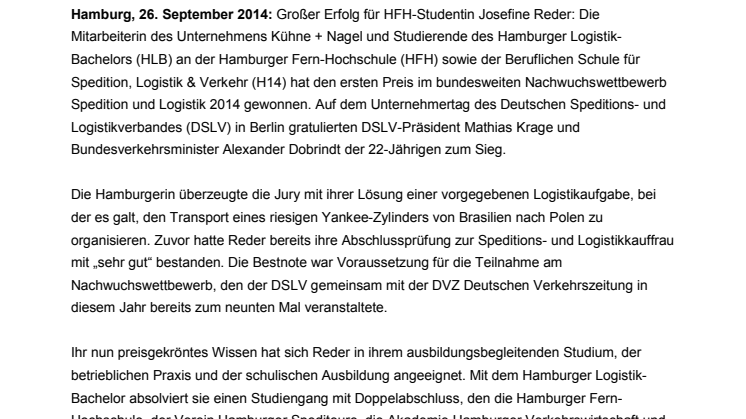 Hamburg, 26. September 2014: Großer Erfolg für HFH-Studentin Josefine Reder: Die Mitarbeiterin des Unternehmens Kühne + Nagel und Studierende des Hamburger Logistik-Bachelors (HLB) an der Hamburger Fern-Hochschule (HFH) sowie der Beruflichen Schule für Spedition, Logistik & Verkehr (H14) hat den ersten Preis im bundesweiten Nachwuchswettbewerb Spedition und Logistik 2014 gewonnen. Auf dem Unternehmertag des Deutschen Speditions- und Logistikverbandes (DSLV) in Berlin gratulierten DSLV-Präsident Mathias Krage und Bundesverkehrsminister Alexander Dobrindt der 22-Jährigen zum Sieg.