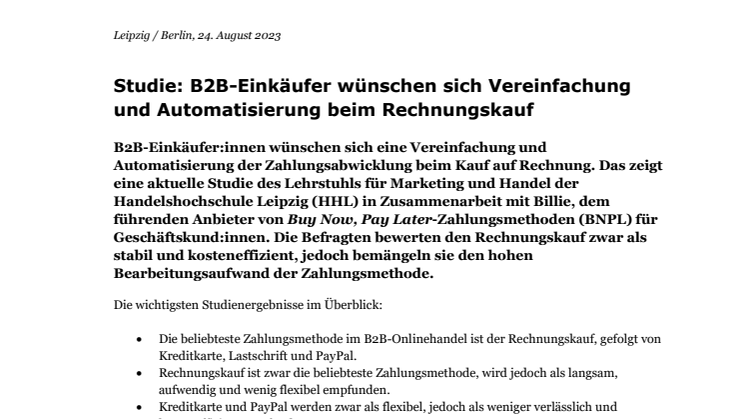 B2B-Einkäufer:innen wünschen sich eine Vereinfachung und Automatisierung der Zahlungsabwicklung beim Kauf auf Rechnung. Das zeigt eine aktuelle Studie des Lehrstuhls für Marketing und Handel der Handelshochschule Leipzig (HHL) in Zusammenarbeit mit Billie, dem führenden Anbieter von Buy Now, Pay Later-Zahlungsmethoden (BNPL) für Geschäftskund:innen. Die Befragten bewerten den Rechnungskauf zwar als stabil und kosteneffizient, jedoch bemängeln sie den hohen Bearbeitungsaufwand der Zahlungsmethode.