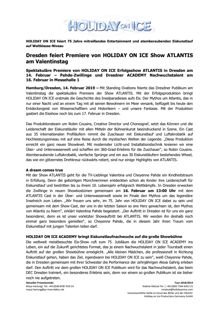 Spektakuläre Premiere von HOLIDAY ON ICE Erfolgsshow ATLANTIS in Dresden am 14. Februar – Pahde-Zwillinge und Dresdner ACADEMY Nachwuchstalent am 16. Februar in Messehalle 1