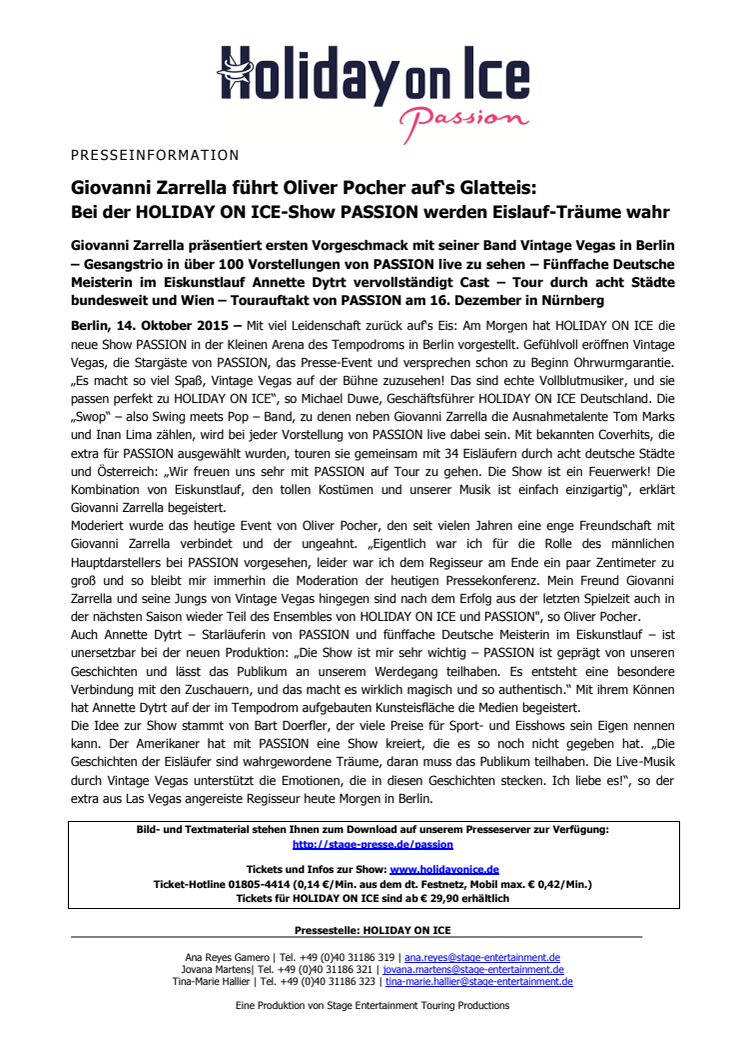 Giovanni Zarrella präsentiert ersten Vorgeschmack mit seiner Band Vintage Vegas in Berlin – Gesangstrio in über 100 Vorstellungen von PASSION live zu sehen – Fünffache Deutsche Meisterin im Eiskunstlauf Annette Dytrt vervollständigt Cast – Tour durch acht Städte bundesweit und Wien – Tourauftakt von PASSION am 16. Dezember in Nürnberg