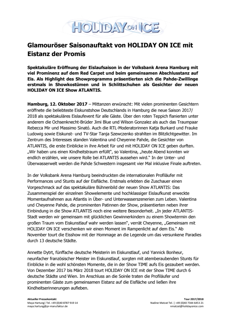 Spektakuläre Eröffnung der Eislaufsaison in der Volksbank Arena Hamburg mit viel Prominenz auf dem Red Carpet und beim gemeinsamen Abschlusstanz auf Eis. Als Highlight des Showprogramms präsentierten sich die Pahde-Zwillinge erstmals in Showkostümen und in Schlittschuhen als Gesichter der neuen HOLIDAY ON ICE Show ATLANTIS.
