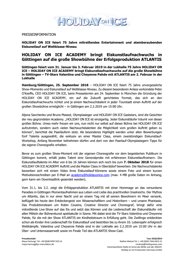 Göttingen feiert vom 31. Januar bis 3. Februar 2019 in der Lokhalle 75 Jahre HOLIDAY ON ICE – HOLIDAY ON ICE ACADEMY bringt Eiskunstlaufnachwuchs auf die große Showbühne in Göttingen –