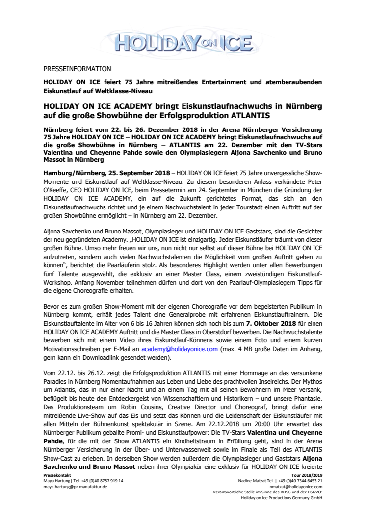 75 Jahre HOLIDAY ON ICE – HOLIDAY ON ICE ACADEMY bringt Eiskunstlaufnachwuchs auf die große Showbühne in Nürnberg – ATLANTIS am 22. Dezember mit den TV-Stars Valentina und Cheyenne Pahde sowie den Olympiasiegern Aljona Savchenko und Bruno Massot in Nürnberg
