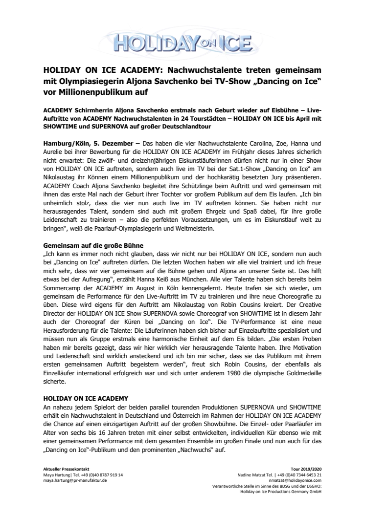 ACADEMY Schirmherrin Aljona Savchenko erstmals nach Geburt wieder auf Eisbühne – Live-Auftritte von ACADEMY Nachwuchstalenten in 24 Tourstädten – HOLIDAY ON ICE bis April mit SHOWTIME und SUPERNOVA auf großer Deutschlandtour