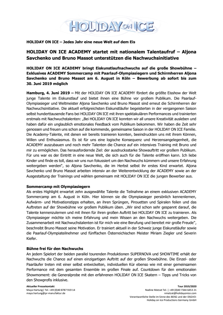 HOLIDAY ON ICE ACADEMY bringt Eiskunstlaufnachwuchs auf die große Showbühne – Exklusives ACADEMY Sommercamp mit Paarlauf-Olympiasiegern und Schirmherren Aljona Savchenko und Bruno Massot am 6. August in Köln – Bewerbung ab sofort bis zum 30. Juni 2019 möglich