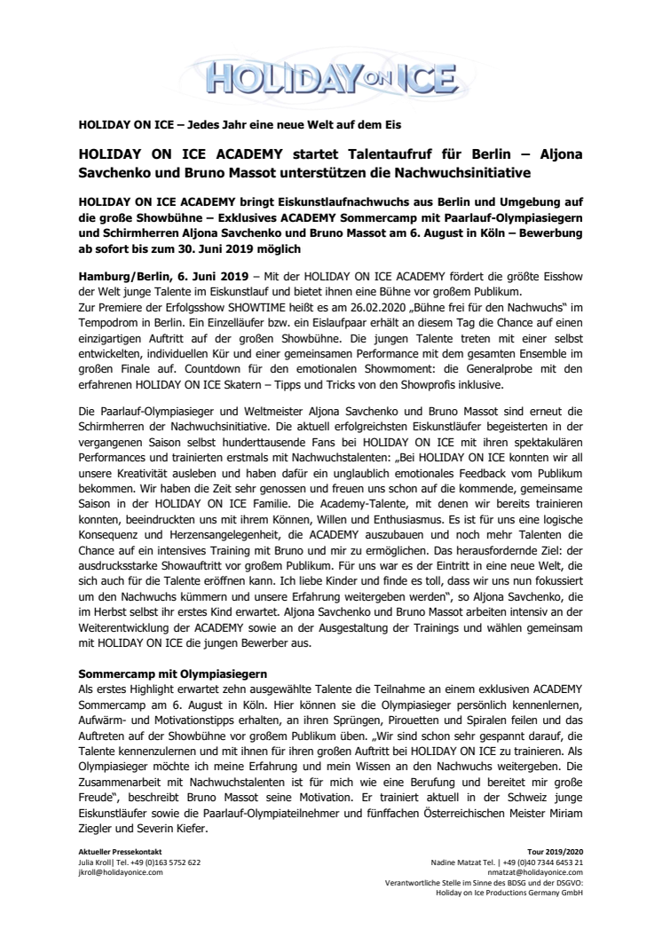 HOLIDAY ON ICE ACADEMY bringt Eiskunstlaufnachwuchs aus Dresden und Umgebung auf die große Showbühne – Exklusives ACADEMY Sommercamp mit Paarlauf-Olympiasiegern und Schirmherren Aljona Savchenko und Bruno Massot am 6. August in Köln – Bewerbung ab sofort bis zum 30. Juni 2019 möglich
