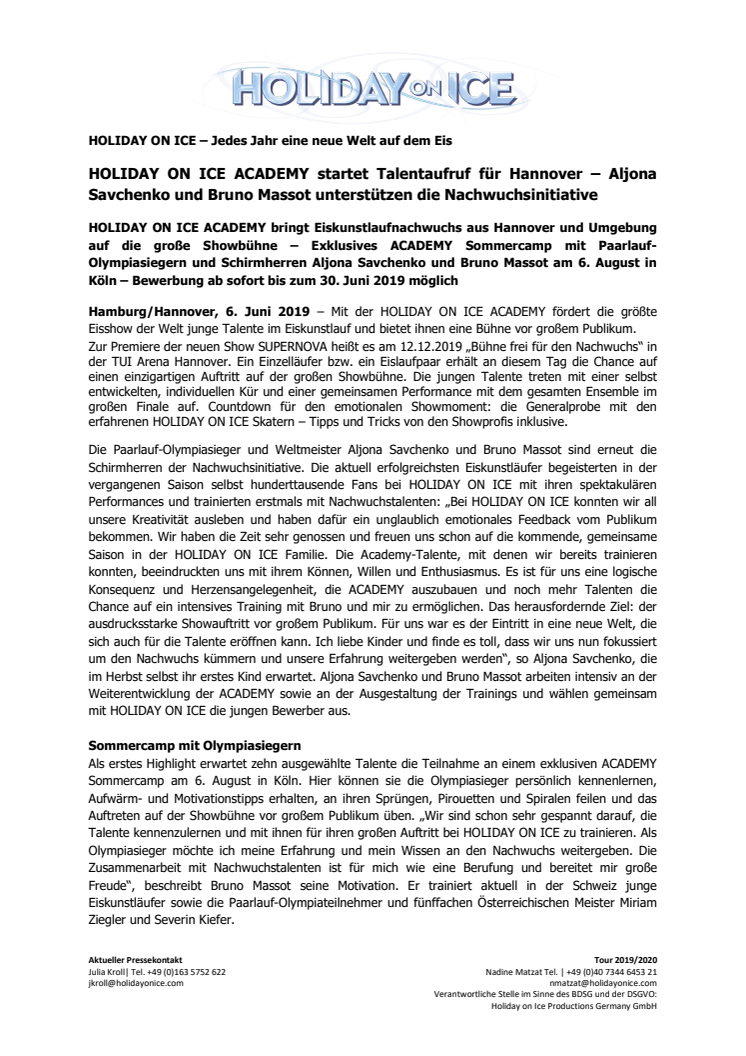 HOLIDAY ON ICE ACADEMY bringt Eiskunstlaufnachwuchs aus Hannover und Umgebung auf die große Showbühne – Exklusives ACADEMY Sommercamp mit Paarlauf-Olympiasiegern und Schirmherren Aljona Savchenko und Bruno Massot am 6. August in Köln – Bewerbung ab sofort bis zum 30. Juni 2019 möglich