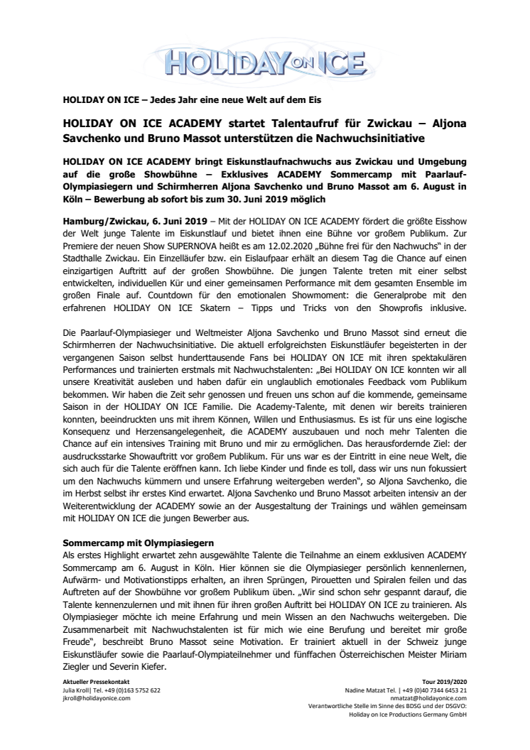 HOLIDAY ON ICE ACADEMY bringt Eiskunstlaufnachwuchs aus Zwickau und Umgebung auf die große Showbühne – Exklusives ACADEMY Sommercamp mit Paarlauf-Olympiasiegern und Schirmherren Aljona Savchenko und Bruno Massot am 6. August in Köln – Bewerbung ab sofort bis zum 30. Juni 2019 möglich