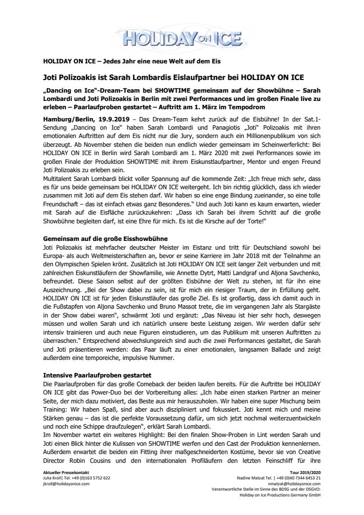 „Dancing on Ice“-Dream-Team bei SHOWTIME gemeinsam auf der Showbühne – Sarah Lombardi und Joti Polizoakis in Berlin mit zwei Performances und im großen Finale live zu erleben – Paarlaufproben gestartet – Auftritt am 1. März im Tempodrom