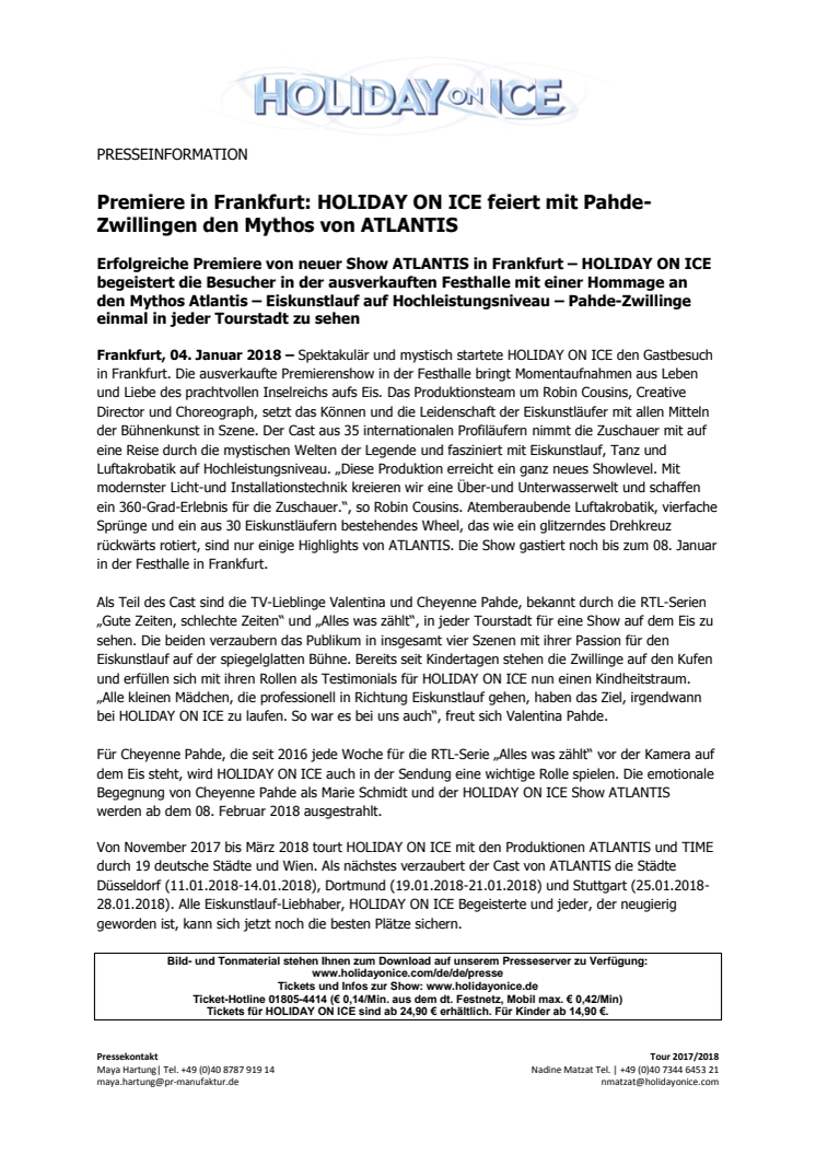 Erfolgreiche Premiere von neuer Show ATLANTIS in Frankfurt – HOLIDAY ON ICE begeistert die Besucher in der ausverkauften Festhalle mit einer Hommage an den Mythos Atlantis – Eiskunstlauf auf Hochleistungsniveau – Pahde-Zwillinge einmal in jeder Tourstadt zu sehen