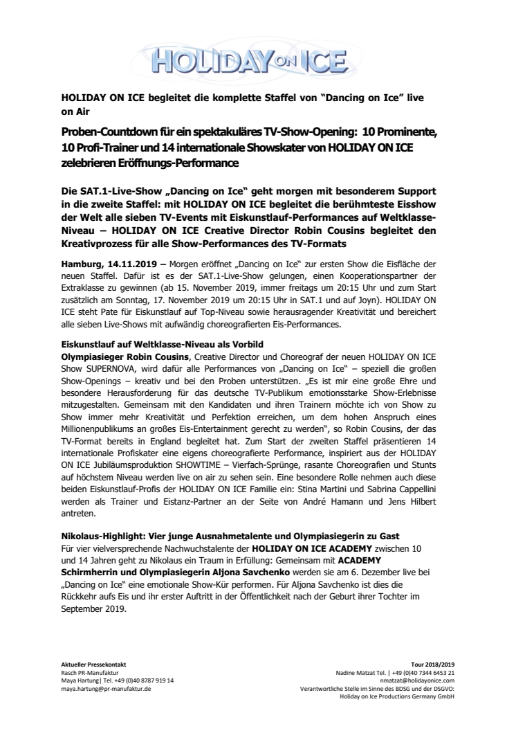 Die SAT.1-Live-Show „Dancing on Ice“ geht morgen mit besonderem Support in die zweite Staffel: mit HOLIDAY ON ICE begleitet die berühmteste Eisshow der Welt alle sieben TV-Events mit Eiskunstlauf-Performances auf Weltklasse-Niveau – HOLIDAY ON ICE Creative Director Robin Cousins begleitet den Kreativprozess für alle Show-Performances des TV-Formats