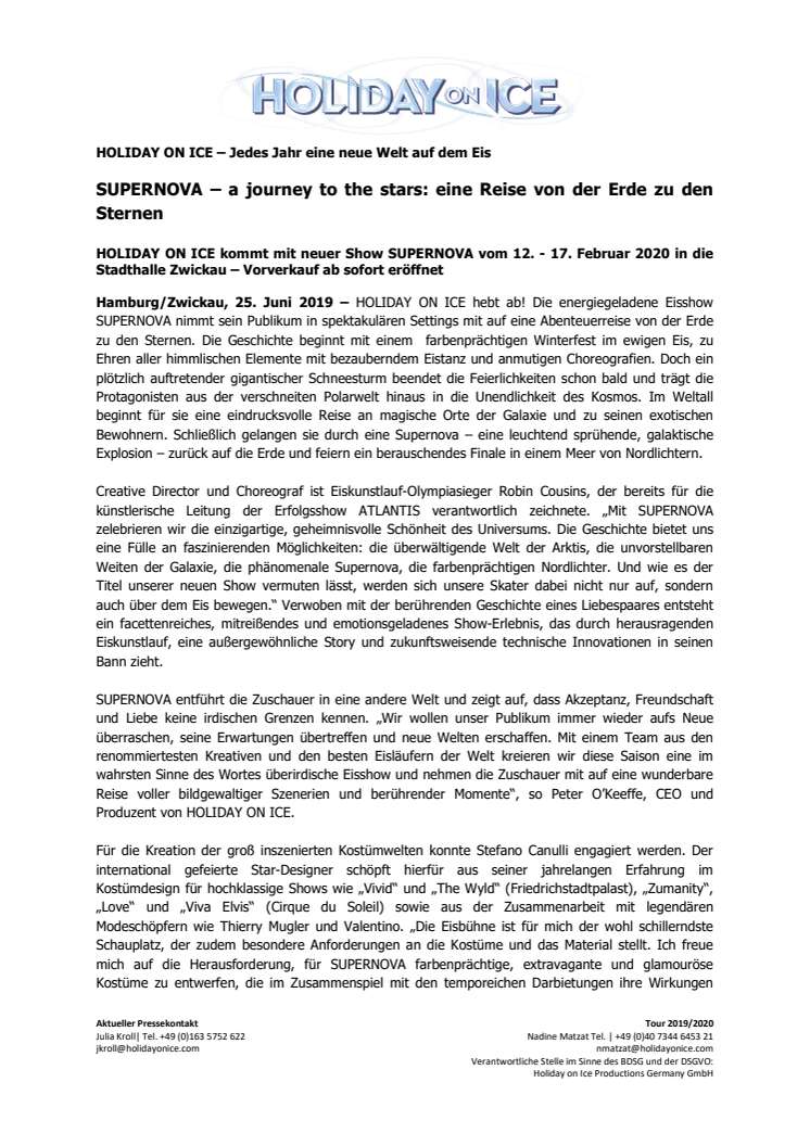 HOLIDAY ON ICE kommt mit neuer Show SUPERNOVA vom 12. - 17. Februar 2020 in die Stadthalle Zwickau – Vorverkauf ab sofort eröffnet