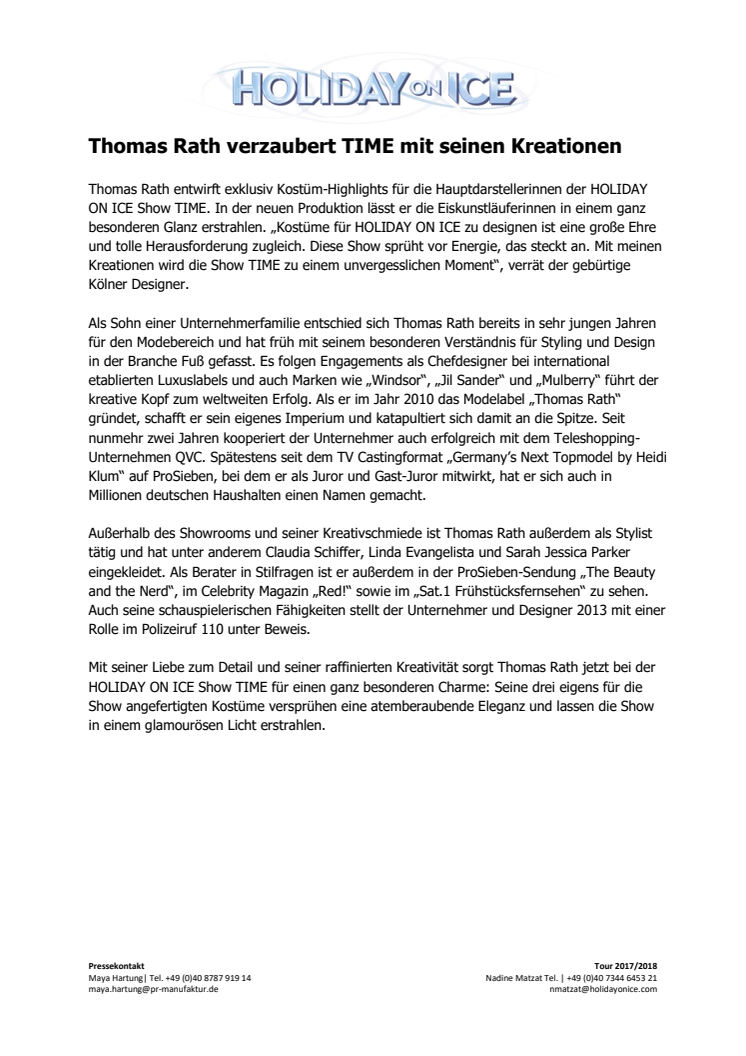 Thomas Rath entwirft exklusiv Kostüm-Highlights für die Hauptdarstellerinnen der HOLIDAY ON ICE Show TIME.