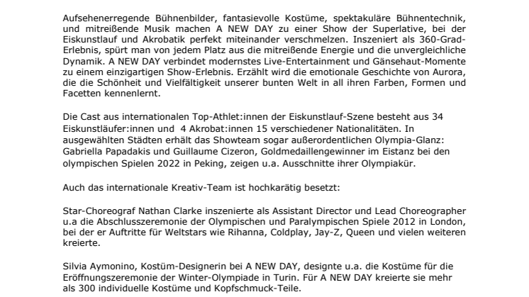 Aufsehenerregende Bühnenbilder, fantasievolle Kostüme, spektakuläre Bühnentechnik, und mitreißende Musik machen A NEW DAY zu einer Show der Superlative, bei der Eiskunstlauf und Akrobatik perfekt miteinander verschmelzen. Inszeniert als 360-Grad-Erlebnis, spürt man von jedem Platz aus die mitreißende Energie und die unvergleichliche Dynamik. A NEW DAY verbindet modernstes Live-Entertainment und Gänsehaut-Momente zu einem einzigartigen Show-Erlebnis. Erzählt wird die emotionale Geschichte von Aurora, die die Schönheit und Vielfältigkeit unserer bunten Welt in all ihren Farben, Formen und Facetten kennenlernt.