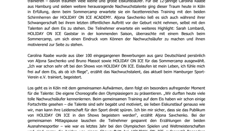 Carolina Raabe wurde aus über 100 eingegangenen Bewerbungen aus ganz Deutschland persönlich von Aljona Savchenko und Bruno Massot sowie HOLIDAY ON ICE für das Sommercamp ausgewählt. „Ich war schon sehr oft bei den Shows von HOLIDAY ON ICE. Eislaufen ist mein Leben, ich fühle mich frei auf dem Eis, als ob ich fliege“, erzählt das Nachwuchstalent, das aktuell beim Hamburger Sport-Verein e.V. trainiert, begeistert.