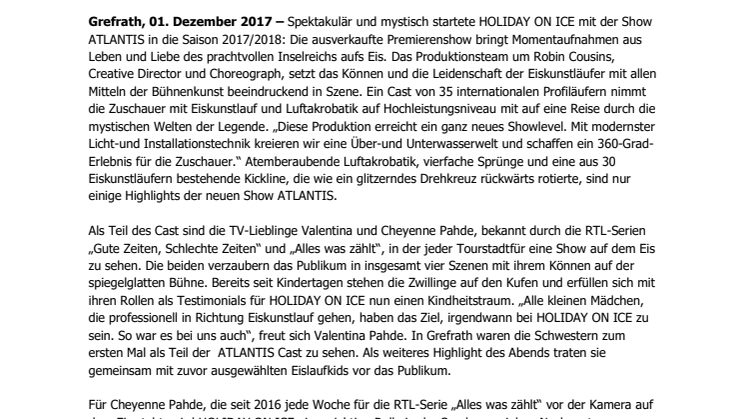 Für Cheyenne Pahde, die seit 2016 jede Woche für die RTL-Serie „Alles was zählt“ vor der Kamera auf dem Eis steht, wird HOLIDAY ON ICE eine wichtige Rolle in der Sendung spielen. Nach ersten Dreharbeiten in Köln, finden am Tag nach der Premiere weitere umfangreiche Aufnahmen in den Kulissen von HOLIDAY ON ICE in Grefrath statt. Die emotionale Begegnung von Cheyenne Pahde in ihrer Rolle als Marie Schmidt und der Show ATLANTIS werden ab dem 08. Februar 2018 ausgestrahlt.