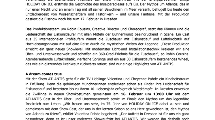 Mit der Show ATLANTIS geht für die TV-Lieblinge Valentina und Cheyenne Pahde ein Kindheitstraum in Erfüllung. Denn die gebürtigen Münchnerinnen entdeckten schon als Kinder ihre Leidenschaft für Eiskunstlauf und bestritten bis zu ihrem 10. Lebensjahr erfolgreich Wettkämpfe. In Dresden erwecken die Zwillinge in neuen Showkostümen gemeinsam am 16. Februar um 13:00 Uhr mit dem ATLANTIS Cast in der Über- und Unterwasserwelt sowie im Finale den Mythos um das legendäre Inselreich zum Leben. „Wir freuen uns sehr, im 75. Jahr von HOLIDAY ON ICE dabei zu sein und gemeinsam mit dem Show-Cast, der uns in der letzten Saison so ans Herz gewachsen ist, den Mythos von Atlantis zu feiern“, erklärt Valentina Pahde begeistert. „Der Auftritt in Dresden ist für uns ein ganz besonderer, denn es ist unser vorletzter Showauftritt bei ATLANTIS. Wir werden ihn deshalb noch einmal ganz besonders genießen“, so Cheyenne Pahde, die in diesem Jahr ihren Traum vom Eiskunstlauf mit jungen Talenten teilen darf.