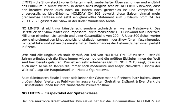 HOLIDAY ON ICE feiert seinen 80. Geburtstag mit der neuen, spektakulären Produktion NO LIMITS - die Show steckt voller Entertainment, zauberhafter Überraschungen und entführt das Publikum in bunte Welten, in denen alles möglich scheint. NO LIMITS beweist, dass der kreative Esprit auch nach 80 Jahren noch grenzenlos ist und verspricht ein unvergessliches Live-Erlebnis. HOLIDAY ON ICE beweist diese Saison einmal mehr grenzenlose Fantasie und setzt ein glanzvolles Statement zum Jubiläum. Vom 24. bis 26.11.2023 gastiert die Show in der Kieler Wunderino Arena.
