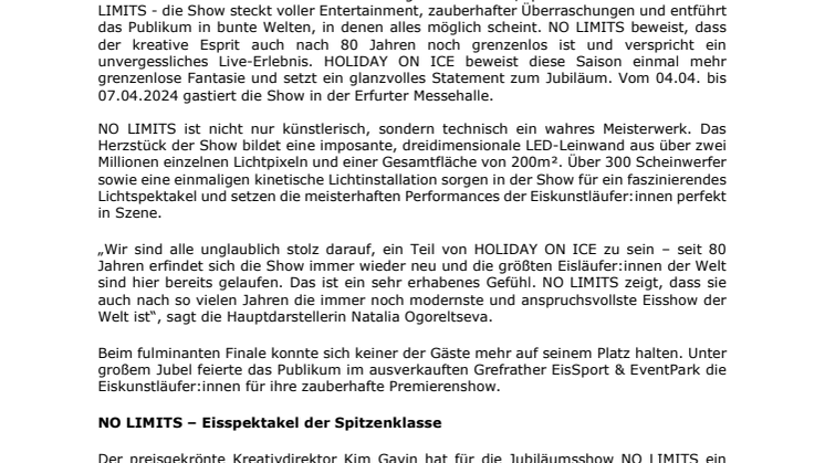 HOLIDAY ON ICE feiert seinen 80. Geburtstag mit der neuen, spektakulären Produktion NO LIMITS - die Show steckt voller Entertainment, zauberhafter Überraschungen und entführt das Publikum in bunte Welten, in denen alles möglich scheint. NO LIMITS beweist, dass der kreative Esprit auch nach 80 Jahren noch grenzenlos ist und verspricht ein unvergessliches Live-Erlebnis. HOLIDAY ON ICE beweist diese Saison einmal mehr grenzenlose Fantasie und setzt ein glanzvolles Statement zum Jubiläum. Vom 04.04. bis 07.04.2024 gastiert die Show in der Erfurter Messehalle.