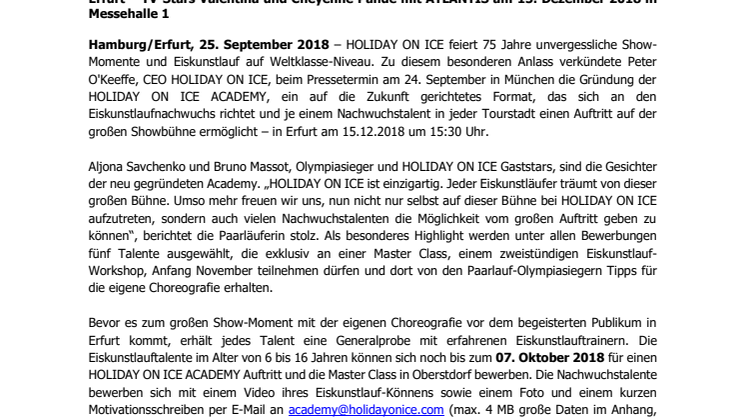 Hamburg/Erfurt, 25. September 2018 – HOLIDAY ON ICE feiert 75 Jahre unvergessliche Show-Momente und Eiskunstlauf auf Weltklasse-Niveau. Zu diesem besonderen Anlass verkündete Peter O'Keeffe, CEO HOLIDAY ON ICE, beim Pressetermin am 24. September in München die Gründung der HOLIDAY ON ICE ACADEMY, ein auf die Zukunft gerichtetes Format, das sich an den Eiskunstlaufnachwuchs richtet und je einem Nachwuchstalent in jeder Tourstadt einen Auftritt auf der großen Showbühne ermöglicht – in Erfurt am 15.12.2018 um 15:30 Uhr.