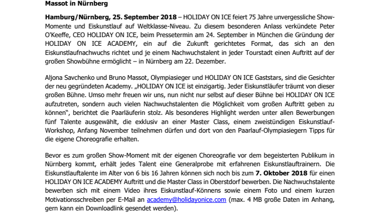 Hamburg/Nürnberg, 25. September 2018 – HOLIDAY ON ICE feiert 75 Jahre unvergessliche Show-Momente und Eiskunstlauf auf Weltklasse-Niveau. Zu diesem besonderen Anlass verkündete Peter O'Keeffe, CEO HOLIDAY ON ICE, beim Pressetermin am 24. September in München die Gründung der HOLIDAY ON ICE ACADEMY, ein auf die Zukunft gerichtetes Format, das sich an den Eiskunstlaufnachwuchs richtet und je einem Nachwuchstalent in jeder Tourstadt einen Auftritt auf der großen Showbühne ermöglicht – in Nürnberg am 22. Dezember.