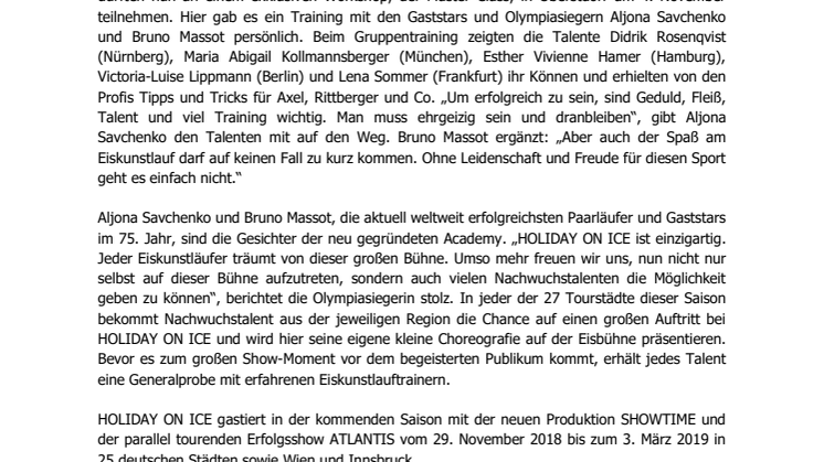 Aljona Savchenko und Bruno Massot, die aktuell weltweit erfolgreichsten Paarläufer und Gaststars im 75. Jahr, sind die Gesichter der neu gegründeten Academy. „HOLIDAY ON ICE ist einzigartig. Jeder Eiskunstläufer träumt von dieser großen Bühne. Umso mehr freuen wir uns, nun nicht nur selbst auf dieser Bühne aufzutreten, sondern auch vielen Nachwuchstalenten die Möglichkeit geben zu können“, berichtet die Olympiasiegerin stolz. In jeder der 27 Tourstädte dieser Saison bekommt Nachwuchstalent aus der jeweiligen Region die Chance auf einen großen Auftritt bei HOLIDAY ON ICE und wird hier seine eigene kleine Choreografie auf der Eisbühne präsentieren. Bevor es zum großen Show-Moment vor dem begeisterten Publikum kommt, erhält jedes Talent eine Generalprobe mit erfahrenen Eiskunstlauftrainern.