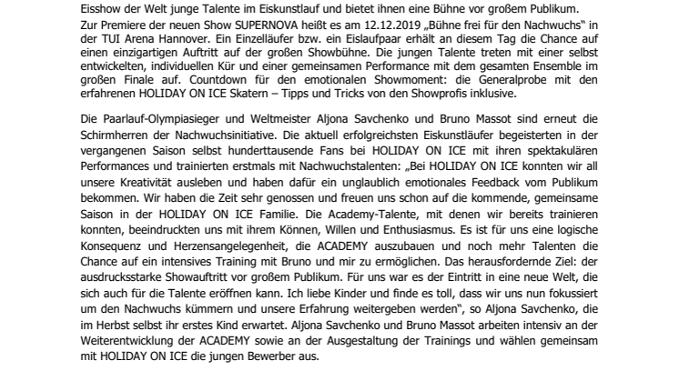 Zur Premiere der neuen Show SUPERNOVA heißt es am 12.12.2019 „Bühne frei für den Nachwuchs“ in der TUI Arena Hannover. Ein Einzelläufer bzw. ein Eislaufpaar erhält an diesem Tag die Chance auf einen einzigartigen Auftritt auf der großen Showbühne. Die jungen Talente treten mit einer selbst entwickelten, individuellen Kür und einer gemeinsamen Performance mit dem gesamten Ensemble im großen Finale auf. Countdown für den emotionalen Showmoment: die Generalprobe mit den erfahrenen HOLIDAY ON ICE Skatern – Tipps und Tricks von den Showprofis inklusive.